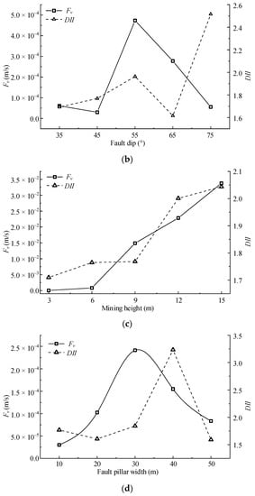 Figure 10b depicts the distribution of DII and Fv with different fall dips during longwall retreat. It is noted that DII fluctuates as the fault dip increases when fault dip is less than 65°, and DII increases rapidly when fault dip is larger than 65°. Fv reaches the peak when the fault dip is equal to 55°. Moreover, when the fault dip reaches 65°, the rapid rise of DII means that the increase in fault dip will lead to a sharp increase in the stress concentration of the fault pillar.