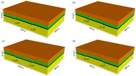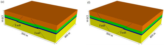 Figure 4 displays the numerical models with the size of 500 m × 400 m × 130 m. This paper aims to obtain the mechanical response characteristics of a specific fault structure rather than to do a parametric study on the rock strata and faults. Therefore in this process, the mechanical parameters of strata and faults are obtained according to reliable literature. The origin (i.e., elastic) mechanical parameters of strata are referred from the literature [], as seen in Table 2. In addition, to obtain the stress distributions in the model, the static displacement boundary is applied around the models. The horizontal displacements around the model and the vertical displacements at the model’s bottom are fixed in the normal direction. At the top of the models, a vertical load (P = γ H = 15.0 MPa, approximately equal to the hydrostatic pressure when the coal seam buried 600 m) was applied to simulate the in situ stress, while stress coefficients along the x- and y-directions were set to 0.8 and 1.5, respectively.