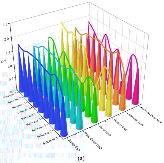 Figure 12a shows the DII distribution of different orthogonal experiment results. For six different combined faults, the distribution of DII is relatively high and close to each other except for some special cases, which indicates that the excavation of the longwall face in the middle of the faults leads to lateral abutment pressure, and the existence of faults on both sides leads to stress concentration near the faults. Furthermore, the similar DII distribution of different combined faults indicates that the correlation between stress concentration and faults type is weak. Additionally, for a special two combined faults type, the difference of DII among different experimental schemes was also small except for some cases, which means that the longwall face will always be affected by high static stress when mining near the combined faults and targeted prevention and control measures should be implemented.