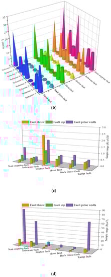 Figure 12c denotes the sample range of DII relating to different orthogonal experimental schemes. It can be seen that the fault pillar width is the primary control factor in the stair-stepping fault and back thrust fault model. Fault throw is the main control factor in the graben fault model, and there are few differences between the three factors in the imbricate fault model, horst fault model, and ramp fault model. It can be concluded that the main control factors are variable when mining near the different combined faults. It warns us that the exploration of fault occurrence must be strengthened, especially for the actual mining process, as faults are variable.