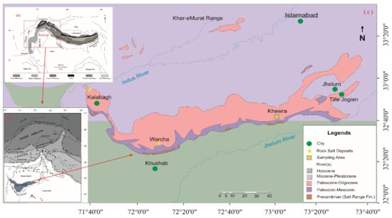 Pakistan has two main salt deposits regions: the Salt Range area and Kohat Plateau []. The Salt Range is one of the interesting and important geological features of Pakistan and designated as museum of geology. It is remnant of the collision between the Indian and Eurasian plates and considered as the youngest and most southern part of the Himalaya in Western Pakistan []. Salt Range is globally famous for the exposure of rocks from Precambrian to the Pleistocene age with four regional and local scale unconformities. The area displays wide varieties of structural styles, salt tectonics, and deposition in varied depositional settings. The Salt Range Formation is one of the excellent laboratory experiments to display the evaporative system in Pakistan, but unfortunately it is the least studied formation, particularly with reference to isotopic studies [,].