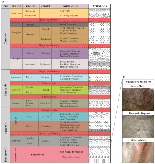 (A) Stratigraphic column of the units within the study area. Lithologies of the different formations are also reported (after Grelaud et al., 2002 []). (B) The Salt Range Member subdivisions (after Sameeni, 2009 [] and Ghazi et al., 2015 []).