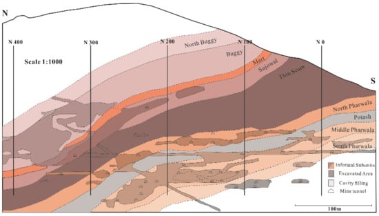 The SR Formation represents the oldest section of the SR area (Figure 2). It was formed in Late Neoproterozoic time, associated with rifting of super continent Pannotia, nearly 560 Ma ago []. Its thickness is approximately 800–2000 m []. The SR Formation is mainly formed of halite, anhydrite, dolomite, gypsum, and, sporadically, oil shale []. The SR Formation is divided into three members based on their location and occurrence: (i) the Billianwala Salt Member, (ii) the Bandarkas Gypsum Member, and (iii) the Sahwal Marl Member (Figure 2A). These three units are outcrop in the Khewra Gorge (type locality: Khewra sandstone). The Billianwala Salt Member incorporates marl, thick seams of halite, and potash seams. The Bandarkas Gypsum Member display marl with important deposits of gypsum that range from crystalline to non-crystalline []. The Sahwal Marl Member consists of (~2–4 m) marl and thick seams of halite [,]. The Billianwala Salt Member is observed in the Khewra salt mine and is divided into seven seams, three in the upper group called the Buggy complex, and four in the lower group called the Pharwala complex. These two groups are separated by a layer of interbedded (salt and marl) seams. The Buggy complex group includes: (1) the North Buggy Salt Seam, (2) the Buggy Seam, and (3) the Sujjawal. The Pharwala Complex include: (1) the upper Pharwala Seam, (2) the Middle Pharwala Seam, (3) the South Pharwala Seam, and (4) the Low-level tunnel Seam (Figure 3).