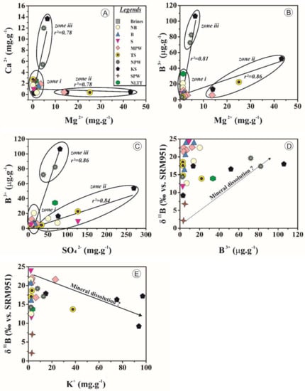 Ion–ion and ion-δ11B covariations in the halite samples. (A) Ca2+ vs. Mg2+. (B) B3+ vs. Mg2+. (C) B3+ vs. SO42−. (D) δ11B vs. B3+. (E) δ11B vs. K+.