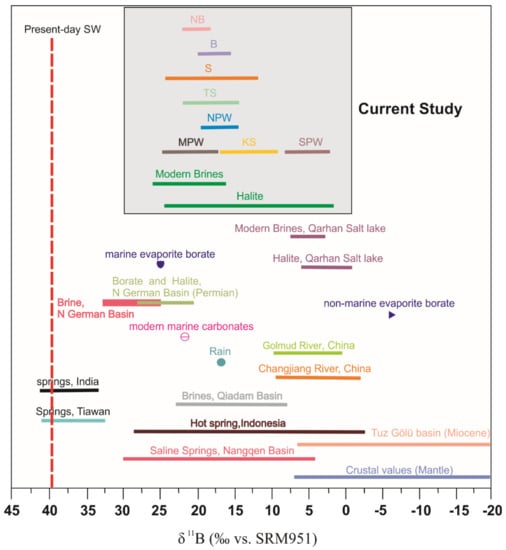 Figure 6 shows a δ11B comparison of halite, brines, hot springs, and river waters from different regions worldwide. Springs from India and Taiwan show B isotope compositions around 40‰, indicating a major influence of seawater. Some saline springs (Nangqen Basin, China) and hot springs from Indonesia, China, and Japan are significantly depleted in 11B compared to present-day seawater, indicating a crustal origin. In China, two rivers, the Changjiang River and the Golmud River, range from −3 to +9‰ and from −0.7 to +9.6‰, respectively, and suggest that these variations result from B isotope fractionation [,] induced by a probable B adsorption on clay minerals [] that causes an enrichment in 11B in aqueous solutions []. δ11B values of modern marine carbonates are about 22.1‰ []. Halite and borate from north German Basin were measured at 20.8 and 27.7‰, and marine evaporite borate and non-marine evaporite borates yielded δ 11B averages of 25 ± 4‰ and −7 ± 10‰, respectively []. Halite in the Qarhan area ranges from −1 to 6‰ and the modern brines from 2.9 to 7.5‰. The halite of the SR area ranges between 2.13 and 24.38‰ and modern brines from 17.31 to 26.31‰. Although XRD results identified no borate minerals the δ11B of our halite samples are almost identical to those of the marine evaporite borate reported by Swihart et al. [].