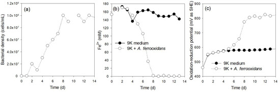 A. ferrooxidans was inoculated into the 9K medium [10] with 9000 mg/L of Fe2+, and the consumption of Fe2+ by its oxidation (Figure 1b) with the growth of A. ferrooxidans (Figure 1a) was studied, along with the corresponding increase in oxidation-reduction potential (Figure 1c).