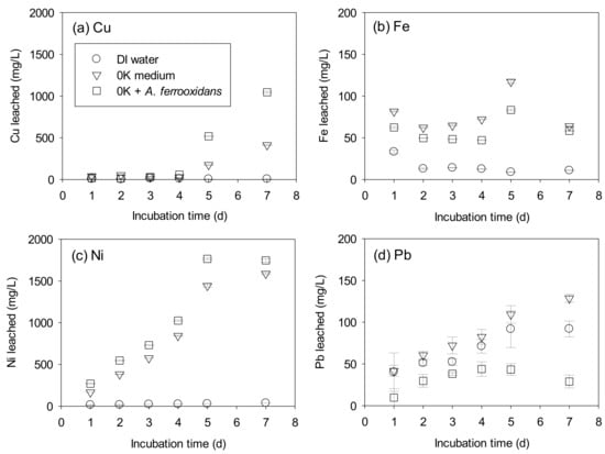 Concentrations of (a) Cu, (b) Fe, (c) Ni, and (d) Pb leached from printed circuit boards (PCBs) for 7 d in the absence (○ deionized (DI) water, ▽ 0K medium) and presence of A. ferrooxidans (□ 0K + A. ferrooxidans). Error bars indicate the standard deviations (n = 3).