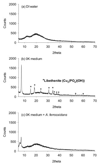 The results of XRD analysis on the precipitates retrieved from the filtration of each leachate are shown in Figure 3. The crystalline mineral libethenite (Cu2(PO4)(OH)) was observed in the sample when 0K medium was injected without A. ferrooxidans. This Cu precipitate is likely to have been formed after Cu leached from the PCBs reacts with anions in the 0K medium. In contrast, no libethenite was found in the sample with A. ferrooxidans, and the XRD pattern of this sample was similar to that of DI water (Figure 3a,c). These results show that inoculation with A. ferrooxidans increases the ORP and promotes additional leaching of Cu, but it also inhibits the precipitation of Cu leached due to the characteristics of the 0K medium. Therefore, Cu is expected to be effectively recoverable by injecting the mixed solution composed of A. ferrooxidans and 0K medium into the PCBs.