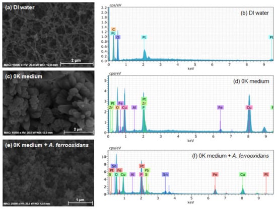 Scanning electron microscope (SEM) images and energy-dispersive X-ray spectrometer (EDS) results of residue on 0.2-μm acetate nitrate membrane filter after filtering the leachate of (a,b) printed circuit boards (PCBs) and deionized (DI) water, (c,d) PCBs and 0K medium, and (e,f) PCBs and 0K inoculated with Acidithiobacillus ferrooxidans.