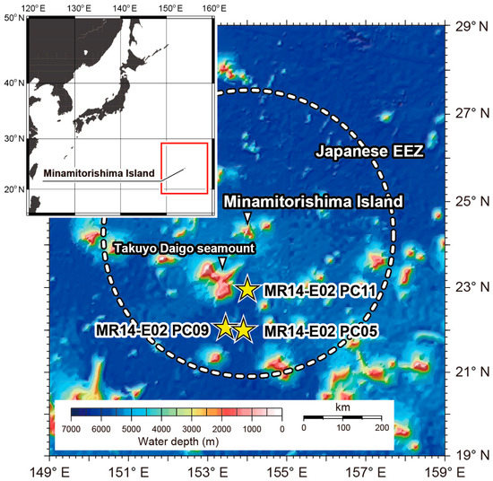Deep-sea sediments around Minamitorishima Island, that is, the easternmost island of Japan in the western North Pacific Ocean, exhibit a total rare-earth element and yttrium (ΣREY) content of up to 8000 ppm [10,11,12,13,14]. To the best of our knowledge, this is the highest REY content reported for REY-rich mud among marine sediments worldwide (e.g., [15,16,17,18,19,20,21,22,23,24,25,26]). The main host of REY in deep-sea sediments is calcium phosphate (apatite), which is present in form of fish teeth and bone fragments (fish debris) in the sediments [12,27,28,29,30,31,32,33]. Because teeth and bones in living fish indicate REY contents several orders of magnitude lower than those in deep-sea sediments [29], previous studies concluded that fish debris incorporate REY from seawater after deposition on the seafloor and/or from pore water during early diagenesis after burial [28,29,30,33]. The average ΣREY of fish debris in western North Pacific sediments is >15,000 ppm (maximum: 22,000 ppm) [12]. Therefore, the very high ΣREY contents of the bulk sediments have been attributed to a significant accumulation of fish debris (up to 30 modal percent [34]). From a palaeoceanographic perspective, it is likely that such an anomalous concentration of REY, or fish debris, in deep-sea sediments reflects specific conditions of the pelagic environment.
