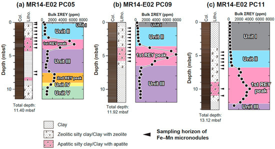 In this study, three piston cores were investigated, which were collected south of Minamitorishima Island in the western North Pacific Ocean during the MR14-E02 cruise operated by the Japan Agency for Marine-Earth Science and Technology and the University of Tokyo. The targeted cores MR14-E02 PC05, PC09, and PC11 (Figure 1) consist of pelagic brown clay with variable abundances of silt-sized zeolite (phillipsite) and apatite (fish debris) grains (Figure 2). The ΣREY content and chemostratigraphic classification of the bulk sediment defined by Tanaka et al. [35] are shown in Figure 2. Considering that the REY-enriched layers in the studied cores are located between Units II and III, all bulk sediment REY peaks from which the Fe–Mn micronodules were separated correspond to the 1st REY peak [35].