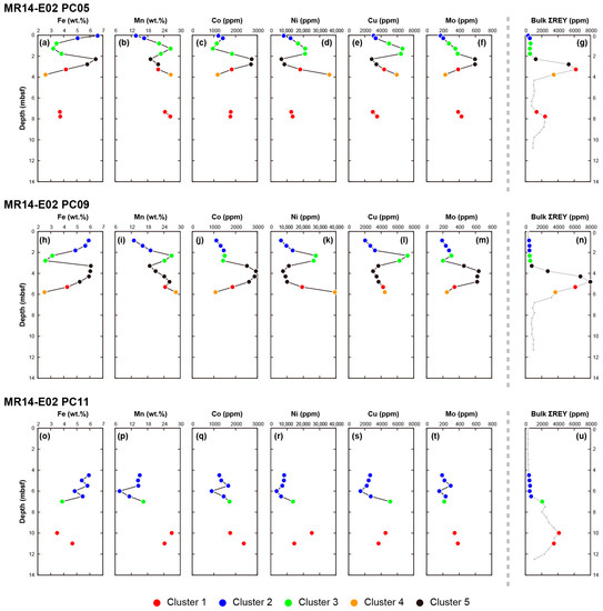 The Fe content is relatively high in the top (0.05–0.30 mbsf in MR14-E02 PC05 and 0.86–1.86 mbsf in PC09) and middle (2.29–2.79 mbsf in PC05 and 3.29–4.81 mbsf in PC09) parts of the profiles (Figure 3a,h). The Fe content of the micronodules in the upper halves of the bulk sediment REY peak is increased. The Co and Mo contents also show prominent maxima in the middle of each profile in cores PC05 and PC09, corresponding to those of the Fe content (Figure 3c,f,j,m). However, in contrast to Fe, neither the Co nor Mo contents in the micronodules in the uppermost parts of the profiles are high. Similar to Fe, it should be noted that the maxima of the Co and Mo contents of the micronodules were determined slightly above the maxima of the bulk sediment ΣREY content in both PC05 and PC09. Compared with PC05 and PC09, general features are less notable in the element content profiles of PC11, which is partly due to the lack of a continuous profile of the micronodule composition because of the paucity of sand-sized micronodules [37].
