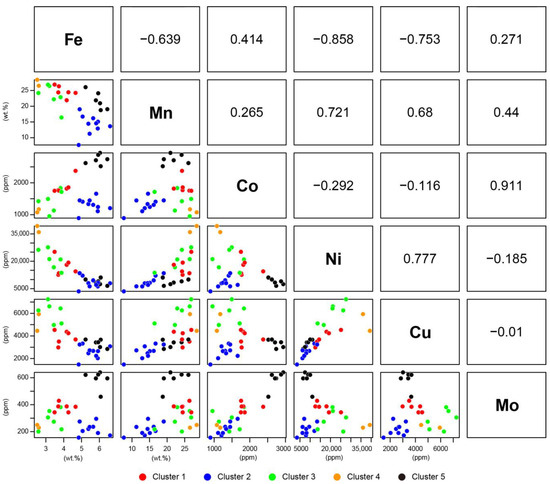 Scatter plot matrix of the Fe–Mn micronodule compositions. The diagonal components represent the variables used in the K-means cluster analysis. The upper panels in the matrix indicate the correlation coefficients for all data. The lower panels show two-dimensional scatter plots for each pair of variables (element contents). The color-coding of the data points is the same as that in Figure 4.