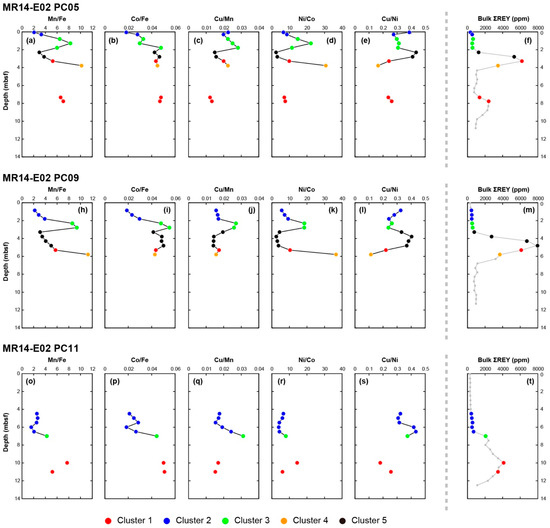 The stratigraphic distributions of these features can be visualized by depth profiles of elemental ratios (Figure 6). Clusters 2 and 5 have relatively lower Mn/Fe ratios (Mn/Fe < 5; Figure 6a,h,o) than C1, C3, and C4 (Mn/Fe > 5, except for one C3 sample in PC11; Figure 6o). Cluster 2 is further characterized by the lowest Co/Fe ratios (Co/Fe < 0.03; here, the Co content was converted to wt.%; Figure 6b,i,p), whereas C5 exhibits the lowest Ni/Co ratios (Ni/Co < 5; Figure 6d,k). Among the clusters with high Mn/Fe ratios, C4 has the highest Mn/Fe (Mn/Fe > 10; Figure 6a,h), highest Ni/Co (>30; Figure 6d,k), and lowest Cu/Ni (<0.18; Figure 6e,l) ratios. Cluster 3 exhibits high Cu/Mn ratios (generally Cu/Mn > 0.025; Figure 6c,j,q). Although the elemental ratios of C1 are moderate, it has relatively low Cu/Ni ratios (Cu/Ni = 0.18–0.26; Figure 6e,l,s). This suggests that C1 reflects the transition between two distinct clusters (C4 and C5). Although PC11 lacks both C4 and C5, the occurrence of C1 at or just below the bulk sediment REY peak in PC11 is consistent with that in the other cores. Thus, the C1 micronodules in PC11 correspond to those in PC05 and PC09.