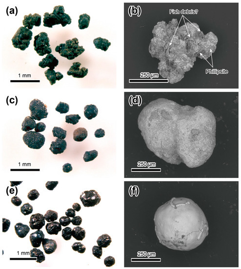 The Fe–Mn micronodules investigated in this study exhibit two distinct types of morphological features and visible textures [37] (Figure 8a–d): botryoidal with rough surfaces and spherical with smooth surfaces. In addition, a subtype of spherical micronodules was observed, exhibiting a metallic luster and remarkably smooth surfaces (Figure 8e,f). In this study, we categorized these features of the Fe–Mn micronodules as “B”, “S”, and “SL”, corresponding to botryoidal, spherical, and spherical with metallic luster, respectively.