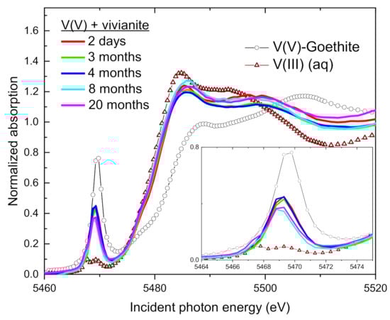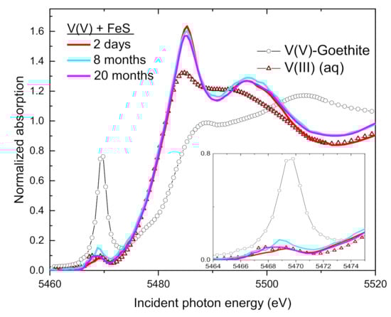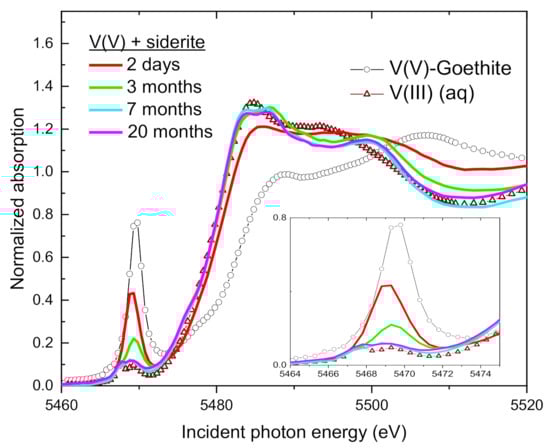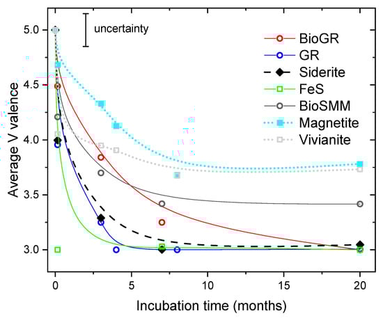 Vanadium(V) was reduced to V(III) in the siderite system (Figure 10). Reduction of V(V) by siderite has been reported by Vessey and Lindsay [60], where after 48 h of reaction, the average valence state of V was 4.14, which is similar to the average valence of 4.0 observed at 48 h in our siderite system. However, in our experiment the average V valence was 3.3 after 3 months with complete reduction to V(III) within 7 months. Although the reduction of V(V) by siderite was only monitored for 48 h in the study by Vessey and Lindsay, it is reasonable to expect that there would have been further reduction over time as their experimental system, like ours, has a large excess of reducing equivalents (the FeCO3:V(V) (mol:mol) was 50:1 in our study and 350:1 in Vessey and Lindsay).