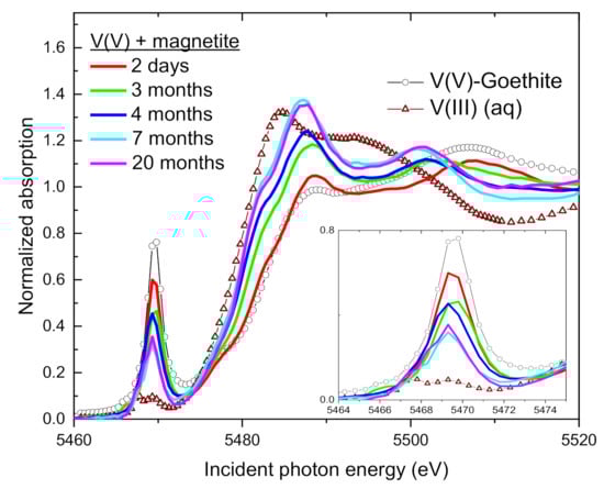 The V K-edge XANES spectra of the solids in the magnetite system over time compared to representative standards V(V) sorbed to goethite and aqueous V(III). Inset shows details in the pre-edge region.