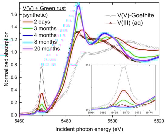 The V K-edge XANES spectra of the solids in the green rust system over time compared to representative standards V(V) sorbed to goethite and aqueous V(III). Inset shows details in the pre-edge region.