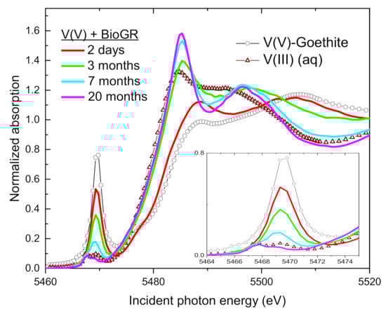 The V K-edge XANES spectra of the solids in the biogenic green rust (BioGR) system over time compared to representative standards V(V) sorbed to goethite and aqueous V(III). Inset shows details in the pre-edge region.