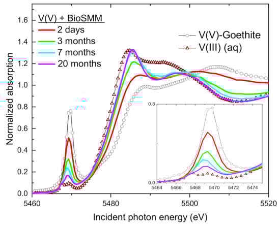 The V K-edge XANES spectra of the solids in the biogenic siderite/mackinawite/magnetite (BioSMM) system over time compared to representative standards V(V) sorbed to goethite and aqueous V(III). Inset shows details in the pre-edge region.
