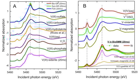 (A) Comparison of the spectra from the final V(III) species in the green rust and FeS reactors to the available V(III) standards. The vertical dashed lines indicate features discussed in the text. The data for the V(III)-hydrotalcite spectrum was digitized from Figure 2 of Rives et al. [108]. The V(III) species in the siderite system after 20 months are shown at the bottom. (B) The spectra of the intermediate V valence species in the vivianite and magnetite systems are compared to the V(IV) standards at the top. The bottom spectra present the linear combination analysis of the V species in the BioSMM system after 20 months. The scaled best fit components that combine to produce the fit line are also shown.