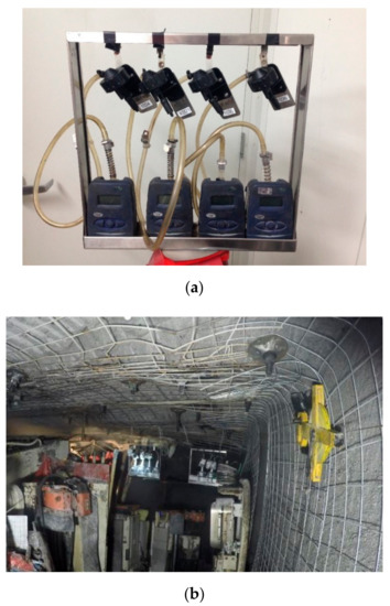 (a) Photo of sampling trains set up inside the frame. (b) Photo of sampling frames installed on continuous miner during sampling.