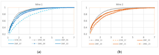 The cumulative particle size for the samples in mines 1 and 2 are shown in (a) and (b) of Figure 3, respectively. The x-axis shows the particle sizes from 1 to 7 microns, while the y-axis displays the cumulative percentage of particles. Lines closer to the top left indicate a finer PSD while those closer to the bottom right indicate a coarser PSD. The continuous miner sample is represented by the dashed line. The longwall maingate samples are represented by the lighter shaded lines with the square markers. The darkest shade denotes the longwall midface samples which were taken in triplicate. The narrow deviation between midface sample lines indicates good agreement between cyclones.