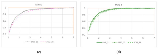 Cumulative particle size by sample. (a) Mine 1 samples, (b) Mine 2 samples, (c) Mine 3 samples and (d) Mine 4 Sammples. X-axis = particle size (microns) and y-axis = cumulative percentage.