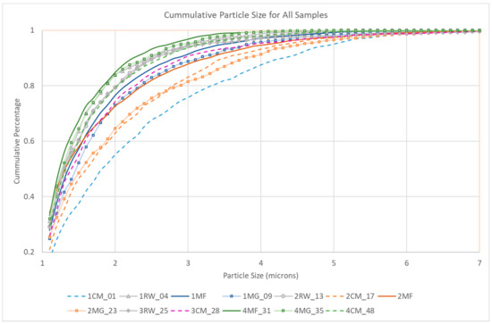 Cumulative particle size for all samples. X-axis = particle size (microns) and y-axis = cumulative percentage (%).
