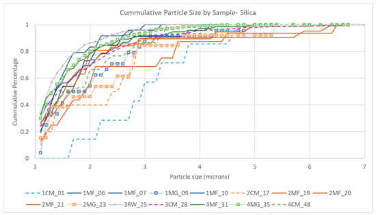 Cumulative particle size for silica particles. X-axis = particle size (microns) and y-axis = cumulative percentage (%).