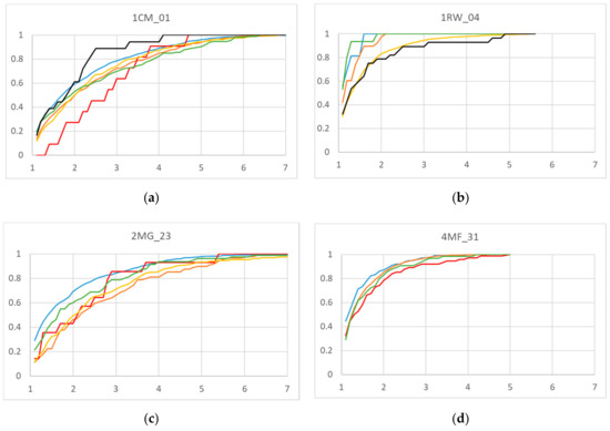 Particle size distributions of various mineralogical classes in samples. (a) Mine 1 continuous miner, (b) Mine 1 roadway, (c) Mine 2 longwall maingate, (d) Mine 4 longwall midface. X-axis = particle size (microns) and y-axis = cumulative percentage.