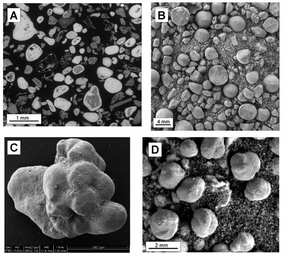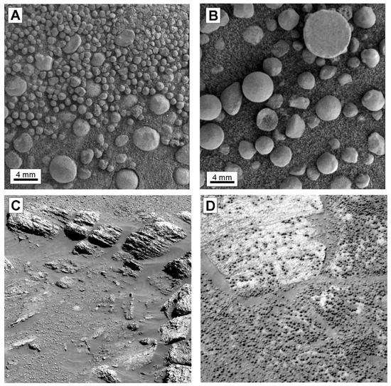 NASA’s rover missions have explored the surface of Mars with the aim to assess local aqueous environments, and with the specific goal of finding evidence of past or present life. The presence of haematite deposits detected in different areas near the equator—by Thermal Emission Spectrometer (TES) on the Mars Global Surveyor (MGS) [1]—has been used to argue for the presence of liquid water on Mars in the distant past. Within regions in which haematite was detected, the Mars Explorations rovers (MER) Opportunity and Spirit discovered mm-size haematite spherules during NASA’s missions. The Martian haematite spherules (Figure 1A,B) have been reported both from in-situ soil deposits and from aeolian dunes as well [2]. Specifically, MER rovers detected in-situ spherules at Meridiani Planum (Opportunity) and on the floor of the Gusev Crater (Spirit) [2,3]. Extensive observations with the Mössbauer [4,5], Alpha-Particle X-ray Spectrometer (APXS) [6] and Mini-TES [7] instruments, confirmed that these spherules are dominantly composed of hematite. These spherules are found within and around outcrop rocks (Figure 1C) at Meridiani Planum, and rolling into the interior of Endurance crater (Figure 1D) [7].