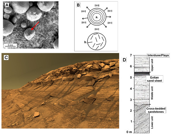 Internal structure of Martian spherules and overview of the Burns Formation exposed at Meridiani Planum. (A) Presence of a possible nucleus in a spherules (see red arrow), image acquired by the Microscopic Imager on NASA’s Mars Opportunity rover; spherule is about 3 mm in diameter (Sol 1216). (B) Internal fabric of a modeled haematite-spherule (a) revealing concentrically grown anhedral haematite crystals with a lattice preferred orientation dominated by [1] axis emission and a modeled spherule (b) composed of concentrically grown anhedral haematite crystals (after Glotch et al., 2006) [26]. (C) Exposure of the Burns Formation at Burns cliff on the southeast rim of Endurance crater; image by the Panoramic Camera on NASA’s Mars Opportunity rover. (D) Stratigraphy of the Burns Formation, modified from Grotzinger et al. [12].