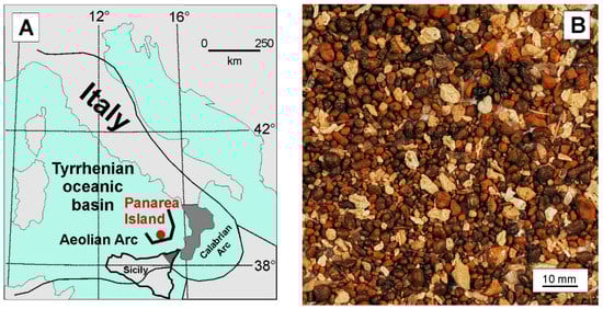 Panarea Island belongs to the Aeolian volcanic arc, which is related to the subduction of the Ionian Sea floor beneath the Southern Tyrrhenian Sea (see Figure 3A). The volcanic arc comprises seven islands (Alicudi, Filicudi, Salina, Vulcano, Lipari, Panarea and Stromboli) and several volcanic seamounts (Sisifo, Enarete, Eolo, Alcione and Palinuro) arranged in a largely submarine, ring-shaped complex of volcanic edifices around the Marsili basin and seamount [34,35].