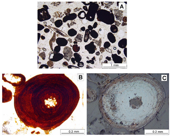 Terrestrial iron spherules from Panarea (Aeolian Archipelago, Mediterranean Sea). The newly formed ooids are associated to a hydrothermal origin. (A) Transmitted-light photomicrograph of thin-sectioned material illustrating main ooidal morphologies. (B) Transmitted- and (C) reflected-light photomicrographs of a thin-sectioned ooid with goethite lamination around an indistinct nucleus. Photos B and C courtesy of F. Messori.