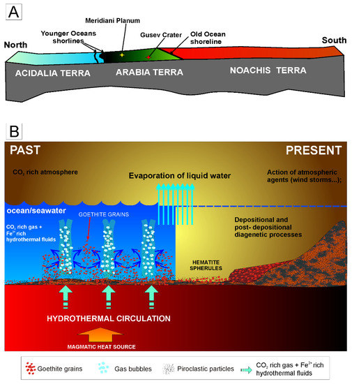 (A) Redrawn image from Mars Orbital Laser Altimeter (MOLA) by Dohm et al. [51], extending from the North Pole to the South Pole and including Terra Arabia Region where Meridiani Planum is located. The image displays the putative shorelines of more ancient and younger oceans between which Meridiani Planum and Gusev Crater are enclosed, suggesting that, in the past, they were areas flooded with water [48,49,50,51]. (B) Conceptual model displaying the Martian goethite spherules formation process in the past and present occurrence in soils and layered sedimentary rocks at Meridiani Planum. In the past, spherules formed in hydrothermal and acidic environment, like in Panarea area, where CO2 and Fe-rich thermal fluids triggered goethite precipitation around particles deposited on the seafloor, acting as accretion nuclei. Then, dehydration processes contributed to transform the goethite spherules into haematite spherules, which presently occur at Meridiani Planum in sedimentary deposits and within layered rocks.