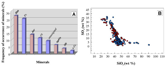 Mineralogical features and S abundance of the Martian analyzed soils. (A) Bar chart of the main analyzed iron minerals (Mossbauer data by Opportunity rover, MER Data Sets Online at Geosciences at link: https://pds-geosciences.wustl.edu/missions/mer/geo_mer_datasets.htm accessed on 9 January 2019) Hm = hematite, Px = pyroxene, Jar = jarosite, Ol = olivine, npOx = iron oxide nanoparticles, Mt = magnetite, a-Fe = alpha iron. (B) SiO2 vs. SO3 variation diagram based on bulk chemical data (APXS) from the NASA database detected for Martian soils by NASA’s Mars Exploration Spirit rover (blue squares) and Opportunity rover (red squares), (MER Data Sets Online at Geosciences at link: https://pds-geosciences.wustl.edu/missions/msl/apxs.htm accessed on 9 January 2019).