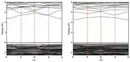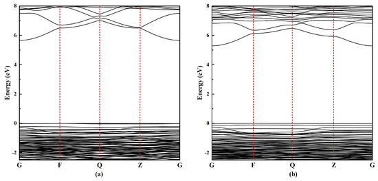 The electrical conductivity of materials is related to the width of the forbidden band, which is the lowest energy required for electrons to transition from valence band to conduction band. The band structure of montmorillonite was analyzed to study conductivity. The band structures of Na-MMT and Mg-MMT along high-symmetry lines of the Brillouin zone (BZ) were plotted in Figure 2a,b. The high symmetry points were G (0,0,0), F (0,0.5,0), Q (0,0.5,0.5) and Z (0,0,0.5), respectively. The Fermi energy level was set at zero. The top of valence band of Na-MMT is at Q, and the bottom of the conduction band is at G. The top of the valence band of Mg-MMT is at F, and the bottom of the conduction band is at G. The result showed they all had indirect band gap. The band gap widths of Na-MMT and Mg-MMT were 4.79 eV and 4.51 eV, respectively, and the band gap width of Na-MMT was significantly larger than Mg-MMT, as shown in Figure 2. The results indicated that the electrons of Na-MMT were more difficult to transition from the valence band to the conduction band than the electrons of Mg-MMT.