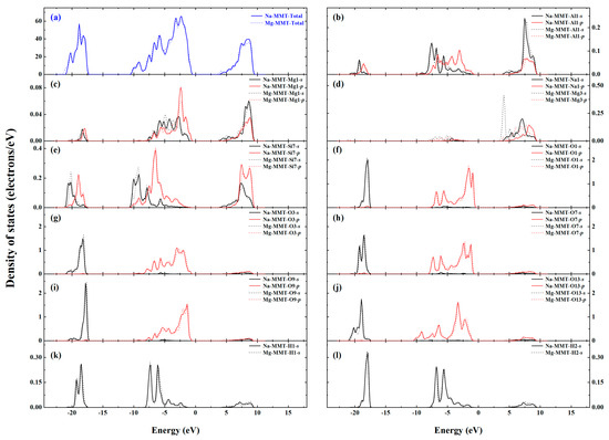 The density of states is the number of electronic states per unit energy near a certain energy, which can reflect the occupation of electrons in each orbital and serve as a visual result of the band structure. The total density of states (TDOS) and projected density of states (PDOS) of Na-MMT and Mg-MMT were depicted in Figure 3. Five different types of oxygen atoms were drawn in a density of states diagram. The results showed that the PDOS curves of the five oxygen atoms were similar, which due to the high ionicity of oxygen atoms, leading to charge transfer from the Al 3p, the Si 3p and Mg 3s states to O 2p states. The analysis of the projected density of states (PDOS) revealed that the valence band of Na-MMT and Mg-MMT was mainly comprised of oxygen p states in the wide energy range of −10 eV to 0 eV. In addition to the contribution of the p states of oxygen to the valence band, there was also a small part of the contribution of the s and p states of Al, Si and Mg. By comparing the density of states of Na-MMT and Mg-MMT, it can be found that the type of interlayer cations has little effect on the density of states.