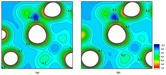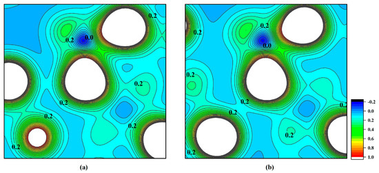 To understand the bonding properties and charge distribution of atoms in Na-MMT and Mg-MMT system more intuitively, the charge density diagrams of Na-MMT and Mg-MMT were drawn in Figure 4a,b, respectively. Figure 4 showed a charge density diagram of the montmorillonite crystal located at the Al6-O11-Si7 plane, and O11 was in the center of diagram. The results showed that the charge density around the O atom was large, which indicated that the oxygen atom had high electronegativity. The oxygen atom coincided with silicon atom and Al atom in part of the charge density, indicating that the Si-O bond and Al-O bond had weak covalent bond properties. The coincidence degree of charge density between Si-O bond was higher than that of Al-O bonds, indicating that the covalent bond property of Si-O bond was stronger than that of Al-O bond. The low charge density around Al atom indicated that there was a large amount of charge transfer between Al and O, which implied that the Al-O bond was mainly characterized by an ion bond. We further analyzed Bader charges of various atoms of Na-MMT and Mg-MMT, as shown in Table 5. Mg atoms of interlayer and of octahedron were defined as MgO and MgI, respectively. Negative values meant the gained electrons and positive values meant the loss of electrons. It was clear that much charge transformed from Al, Si, Mg atoms to O atoms. Si atoms lost the most charge, indicating that Si-O had the strongest bonding effect.