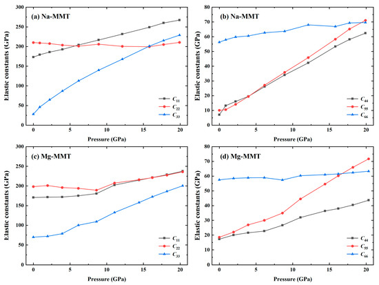 The calculated elastic constants (Cij) of the Na-MMT and Mg-MMT under different pressures. (a) Calculated value of C11, C22 and C33 of Na-MMT under given pressures; (b) calculated value of C44, C55 and C66 of Na-MMT under given pressures; (c) calculated value of C11, C22 and C33 of Mg-MMT under given pressures; (d) calculated value of C44, C55 and C66 of Mg-MMT under given pressures.