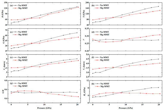 The calculated value of elastic modulus, Poisson’s ratio, wave velocity, Vicker’s hardness and Push’s modulus of Na-MMT and Mg-MMT under different pressure. (a) Bulk modulus (B); (b) Young’s modulus (Y); (c) shear modulus (G); (d) Poisson’s ratio (µ); (e) compression wave velocity (Vp); (f) shear wave velocity (Vs); (g) Push’s modulus (G/B); (h) Vicker’s hardness (Hv).