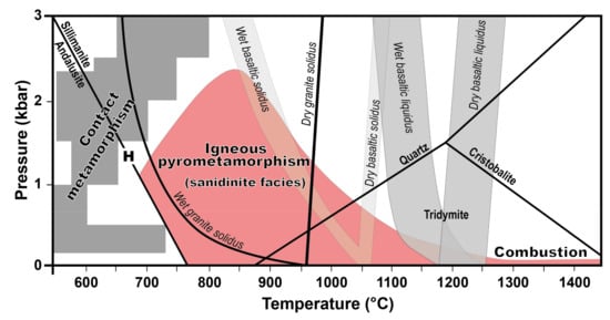 Pyrometamorphism is a type of thermal metamorphism involving very high temperatures—often to the point of melting in suitable lithologies at low pressures—that has been extensively reviewed by Grapes [1]. Pyrometamorphic rocks are micro-cryptocrystalline to glassy, as the result of processes of recrystallization and melting/crystallization under high temperature/low pressure conditions. The term pyrometamorphism (from the Greek pyr/pyro: fire; meta: change; morph: shape or form) was first used by Brauns [2] to describe high temperature changes taking place at the immediate contact of magma and country rocks with or without metasomatic processes. The high temperatures can be provided by magma (i.e., igneous pyrometamorphism), spontaneous combustion of coal, carbonaceous sediments, oil and gas (giving rise to the so called paralavas), or lightning that strikes at the surface. All of these conditions characterize the sanidinite facies of metamorphism (Figure 1).