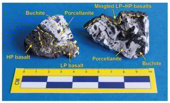 Two fragments of the composite B1 xenolith consisting of white porcellanite and dark buchite. Cuspate–convolute contacts between porcellanite and buchite portions are highlighted, as well as the juvenile basalt coating the sample. Both HP (highly porphyritic, black scoria) and LP (low porphyritic, highly vesicular “golden” pumice) are emphasized, as distinct magmas or mingled with each other. It is worth noting that the LP basalt is only involved during the paroxysmal eruption of Stromboli such as that of the 5 April 2003 when the porcellanite–buchite xenolith erupted.