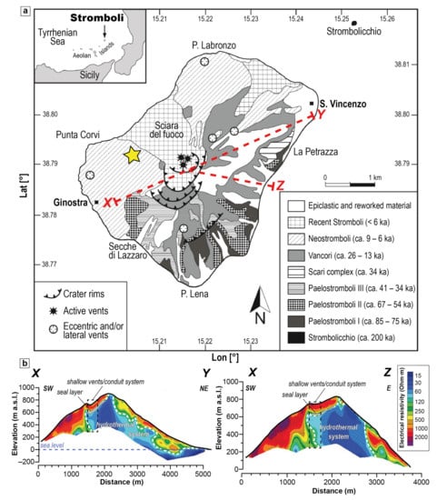 The shallow active hydrothermal system of Stromboli has been studied by many authors (e.g., [44,61,67,68,69,70,71,72]) via temperature, spontaneous potential field anomalies, CO2 emissions’ measurements, and passive seismic studies monitoring. This hydrothermal system, highlighted by a conductive body with electrical resistivity in the range 15–50 ohm·m, is located in the central part of the volcanic edifice with an extension in both the northeast and east directions (Figure 3b) [44].