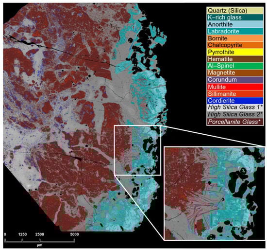 The composite porcellanite–buchite sample B1 is a cryptocrystalline to glassy pyrometamorphic rock where cordierite, mullite/sillimanite, aluminous spinel and corundum represent the main recognized silicate and oxide minerals [21], together with abundant sulphide globules. With respect to analysis of the context of the evolution of the composite xenolith, it is important to note that the basalt coating the xenolith is represented by the two juvenile magmas commonly erupted during paroxystic eruptions of Stromboli, namely LP and HP basalts (Figure 2). In the high resolution QEMSCANTM map of Figure 4 (ca 1.25 cm × 1.75 cm) that shows the distribution of mineral phases (as colour variations) across the B1 sample, the main silicates, oxides and sulphides are emphasized, and it is evident that most of the xenolith consists of silicate glass.
