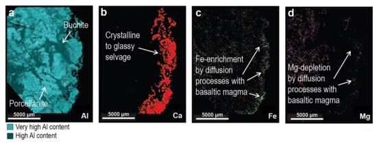 The white porcellanite and dark buchite should be considered as distinct rock domains of the sample. A very thin crystalline to glassy selvage (previously defined as mullite–plagioclase palisade by Del Moro et al. [21]) made of acicular mullite–corundum, aluminous spinel and plagioclase + glass, marks, to a depth of maximum 4 mm (Figure 4), the contact with the juvenile basalt mantling the ejecta. Spinels in the selvage have lower Al2O3 (43.7–63.9 wt.%) and higher FeOtot (18.8–38.8 wt.%) with respect to those in the porcellanite–buchite main xenolith (Al2O3 59.9–64.0 wt.%; FeOtot 12.3–12.4 wt.%) [21]. This can be the result of Fe-enrichment by diffusion processes from the basaltic magma at the contact with the xenolith. As shown in Figure 4, plagioclase in the selvage, forming tabular and prismatic crystals up to 500 μm in length, is characterized by a relatively high content of anorthite (from An82 to An92; [21], mostly emphasized as labradorite or anorthite in Figure 4) and FeOtot 0.5–2.3 wt.%. The relatively high to very high Al-content throughout the composite xenolith is highlighted in Figure 5a, whereas the crystalline to glassy selvage at the contact with the main porcellanite–buchite is characterized by a strong Ca enrichment and a relatively high content of Fe with respect to Mg (Figure 5b–d).