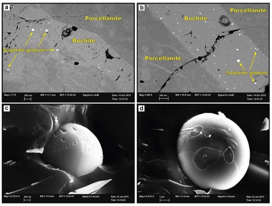 FESEM backscattered image of the composite B1 xenolith at lower (a) and higher (b) magnification, showing intimately mingled porcellanite and buchite. The two portions of the pyrometamorphic xenolith are also distinguished by the presence of sulphide globules only in the buchite portions as further emphasized in the X-ray μCT imaging provided in Figure 8a and Video S1. Sharpened FESEM images of sulphide globules exposed on the surface of a buchite glass shard from sample B1, having a size of about 2 μm and 8 μm are shown in (c) and (d), respectively.