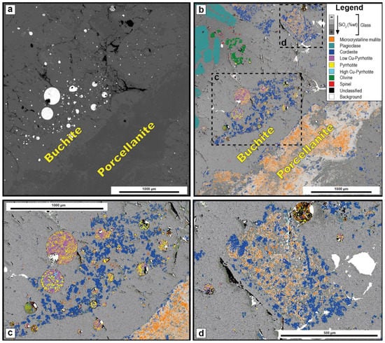 Backscatter FESEM image with the bright sulphide globules in the buchite portion (a); QEMSCANTM map (step size of one pixel to the other is 1.3 μm) of the B1 porcellanite–buchite composite xenolith (b); close–up of the QEMSCANTM map (buchite portions): sulphide globules (pyrrhotite, Low-Cu pyrrhotite and High-Cu pyrrhotite) (c); pseudomorphic clinopyroxene of the early protolith of the xenoliths mainly replaced by cordierite and mullite (d). For abundance and size distribution of the sulphide globules, see also X-ray μCT scan data in Figure 8a and presented in the Supplementary Materials (Video S1, Table S1).
