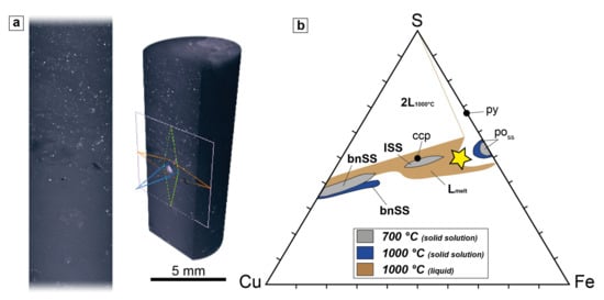 (a) Slices of the composite porcellanite–buchite xenolith of Stromboli through the 3D X-ray µCT data for a 5 mm diameter core (high resolution 2.3 µm voxel size). They show the sulphide globules (as bright spots) in xz planes as we see flying through the 3D data in the video (see Video S1) where their abundance is far larger than how it appears on a 2D polished section surface due to steric effects (polished sections only expose minerals at a single surface so that fine particles beneath the immediate surface are not visible); (b) phase relations in the Cu–Fe–S system at 700 °C and 1000 °C from Vaughan and Craig [83] adapted from Barton and Skinner [84]. L = liquid; SS = solid solution; bn = bornite; ISS = intermediate solid solution; py = pyrite; po = pyrrhotite; ccp = chalcopyrite. The yellow star is the approximate bulk composition of the sulphide globules quenched as immiscible liquid in the buchite portion of the B1 xenolith. The composition of the sulphide globules corresponds to a theoretical pyrrhotite—chalcopyrite tie line.